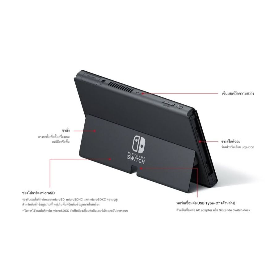 Nintendo Switch - OLED Model มาพร้อมกับความจำเครื่องขนาด 64GB (มีการสำรองให้กับระบบปฎิบัติการของตัวเครื่อง), มีการอัพเกรดระบบเสียงในโหมด Handheld และ Tabletop, ขาตั้งตัวเครื่องแบบยาว, dock รูปแบบใหม่มาพร้อมการเชื่อมต่อด้วยสาย LAN (LAN cable sold separately).